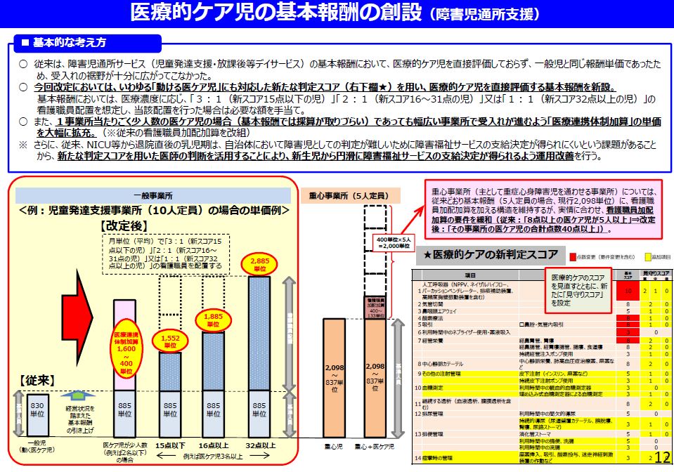 今回改定においては、いわゆる「動ける医ケア児」にも対応した新たな【判定スコア】を用い、医療的ケア児を直接評価する基本報酬を新設します。