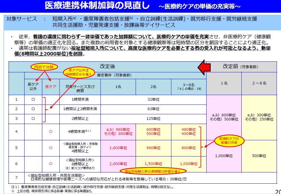 医療連携体制加算については、医療機関等との連携により、当該医療機関等から看護職員を訪問させ、利用者に看護を提供した場合や認定特定行為業務従事者に対し喀痰吸引等に係る指導を行った場合に算定できるものだが、算定要件や報酬単価について必要な見直しを行う。