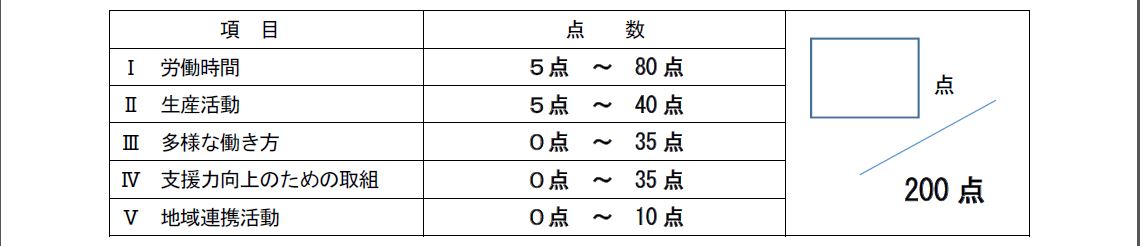 上記の【ⅰ 1日の平均労働時間】【ⅱ 生産活動】【ⅲ 多様な働き方】【ⅳ 支援力向上】【ⅴ 地域連携活動】を200点満点でスコア計算をする。